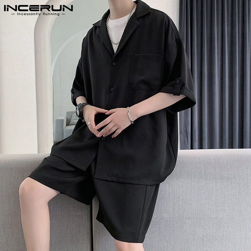 INCERUN Men Short Sleeve Korean Style Casual Suits Button Shirts Elastic Waist Short Sets (Korean Style)